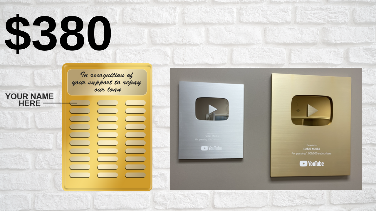 Get a brick on the wall and get your name on a plaque that we will hang in our boardroom alongside our YouTube milestone plaques. We will only have enough space for a few plaques, so supplies are limited!