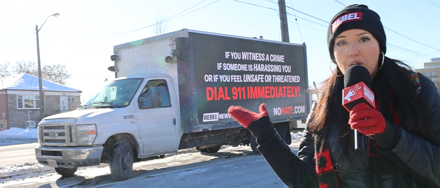 TORONTO: The anti-Israel mob protesting the Jewish community's Menorah lighting faces off with Rebel's No Hate billboard truck message.