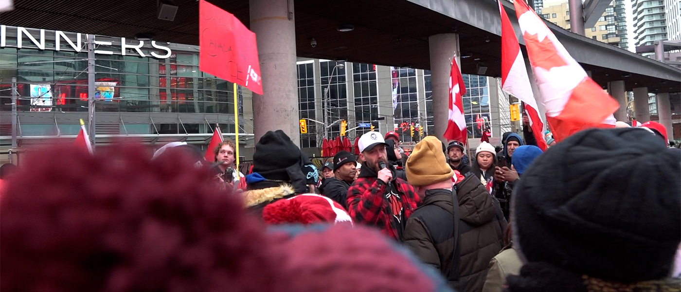 Though the event received a modest turnout of supporters waving Canadian flags, it quickly attracted a larger counter-protest from groups like Community Solidarity Toronto, Antifa agitators, local unions, and 'anti-racism' organizations.