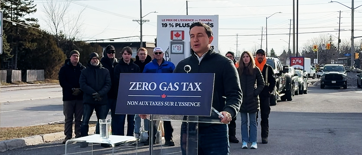 On Thursday, April 2, Pierre Poilievre held a press conference at a MacEwen gas station in Ottawa to address soaring gas prices. The podium displayed the slogan “Zero Gas Tax.”