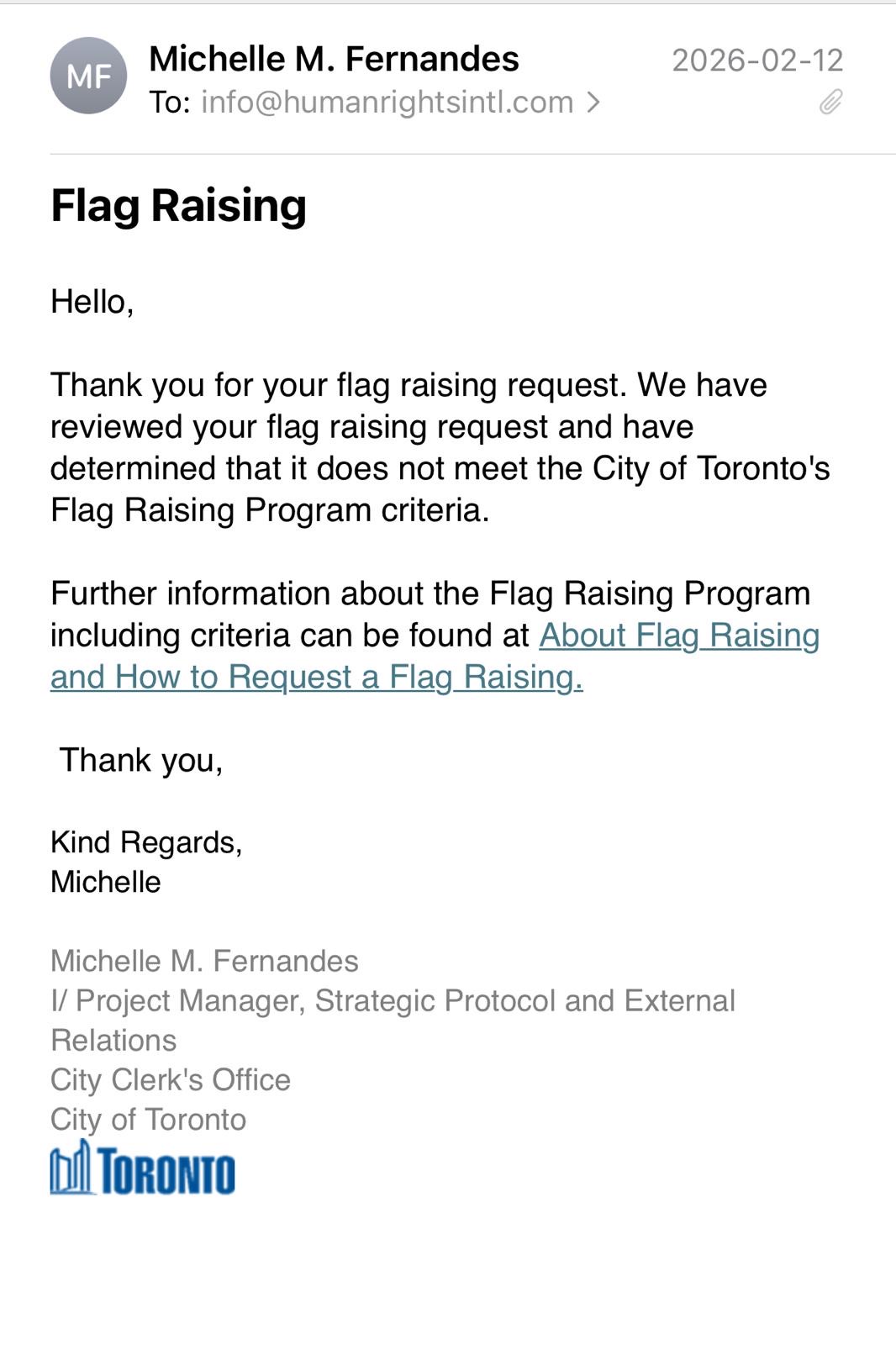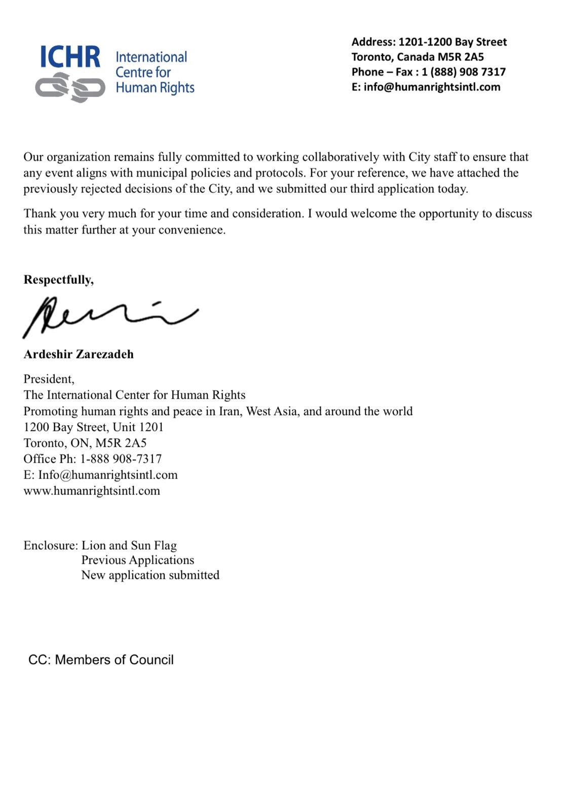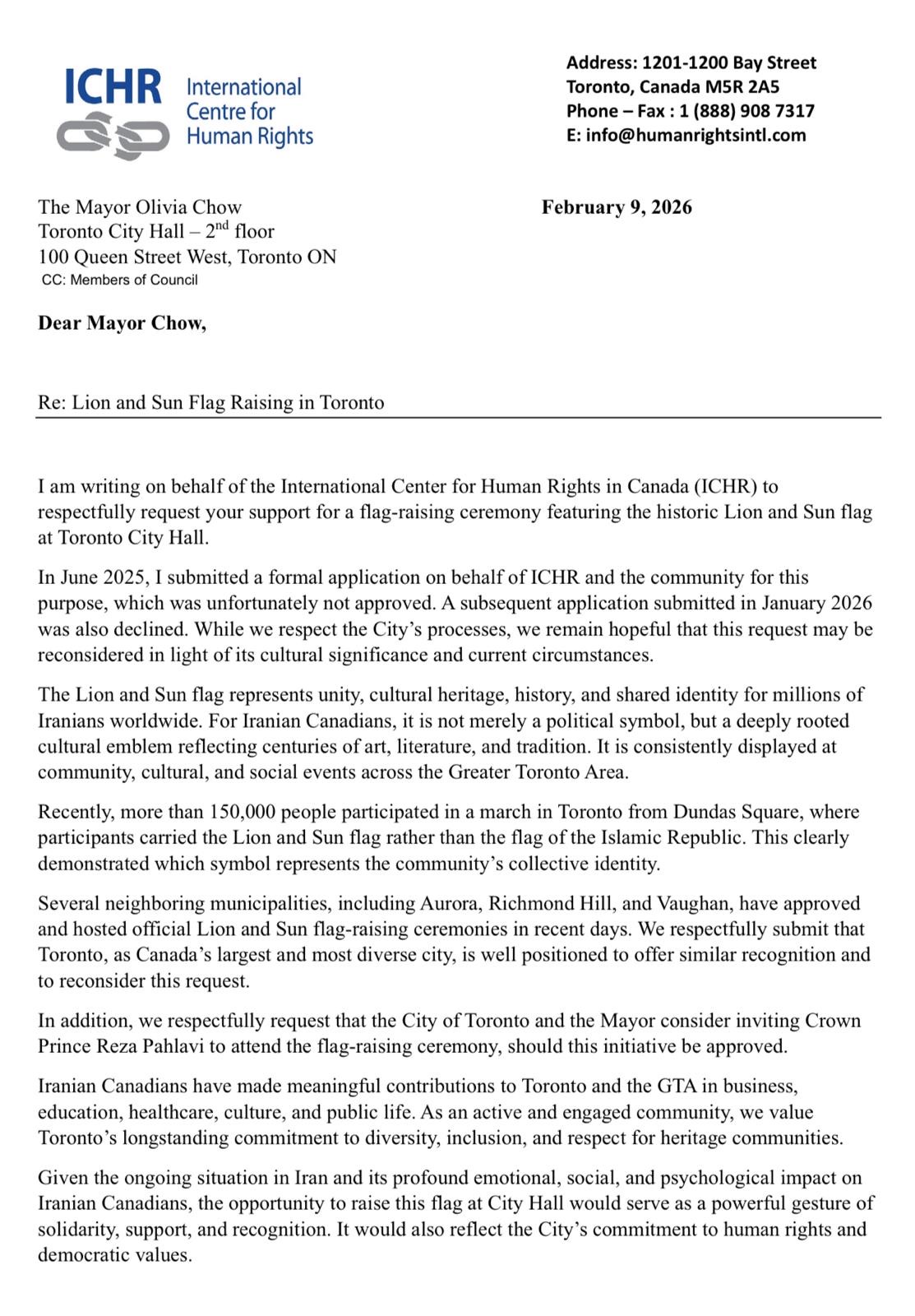 He sent a letter to Mayor Olivia Chow and made another official application on February 9. The third application to raise Iran’s Lion and Sun flag at Toronto City Hall was rejected. He was given the simple explanation that “it does not meet the City of Toronto’s Flag Raising program criteria.” Zarezadeh expressed frustration at this: “I explained in the letter why this is important ... She is still the Mayor of Toronto. She can’t disregard one community and advocate for another community.”