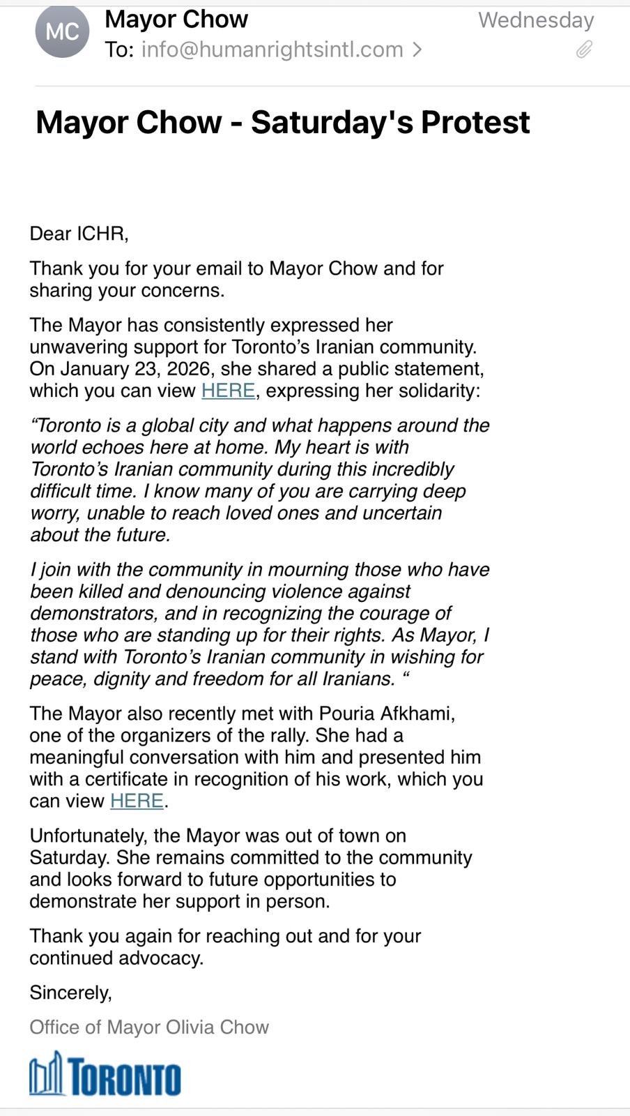 In an email response to the International Centre for Human Rights, her office stated she was out of town on February 14 and further justified her absence by listing other things Chow has done to appease the Iranian community as of late, without showing explicit support of their cause. This still does not explain her absence on February 1, January 21, January 17, January 13, and January 10 at other major rallies for Iran that gathered tens of thousands of community members.