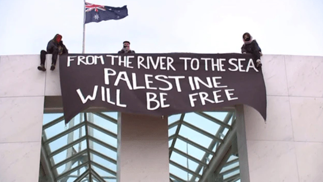 They displayed a large black banner reading, “From the river to the sea, Palestine will be free” and “no peace on stolen land.” Another banner, hung under the Australian Coat of Arms, accused the government of enabling war crimes.