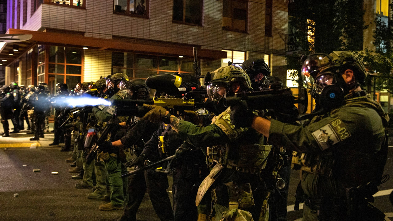 “Officers identified the individual who threw the explosive and attempted to arrest the person. As a group off bike officers attempted to make the arrest they were then assaulted with bottles and rocks. Police deployed pepper spray and blast balls in an attempt to create space between the officers and the protestors.”