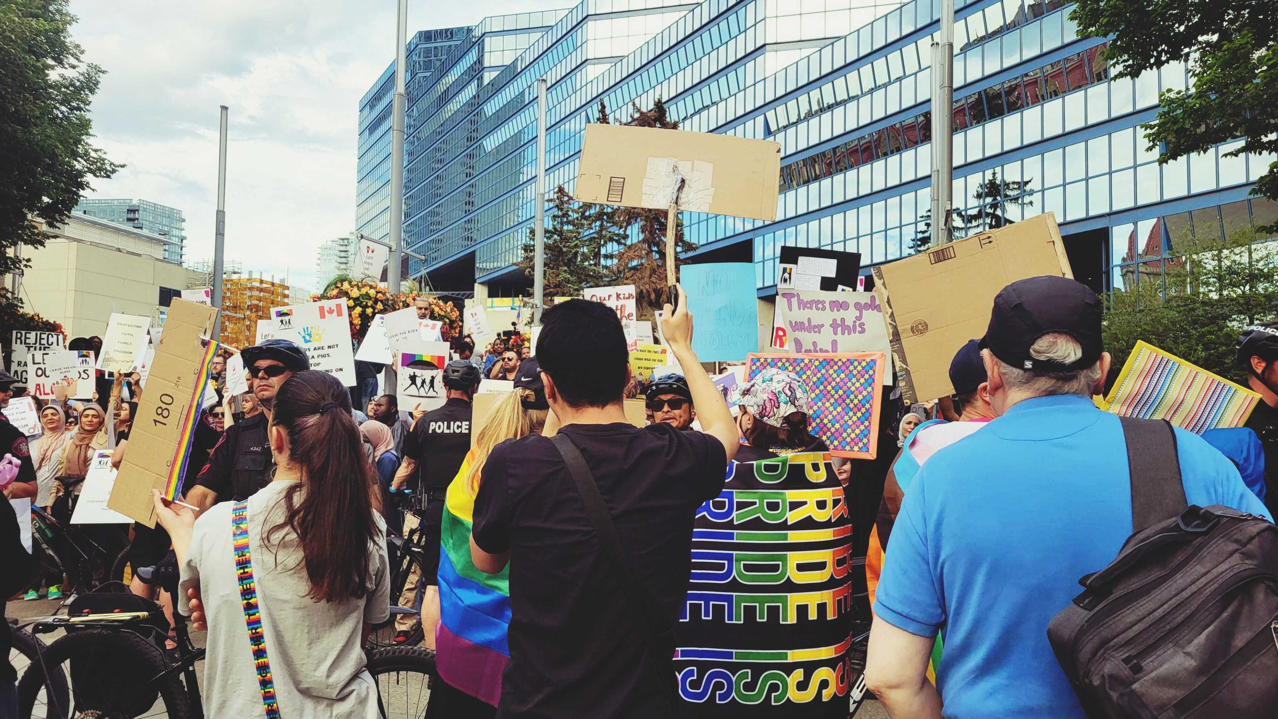 Tension seemed higher at the more recent protest, with several arguments erupting between the protesters and a group of counter-demonstrators nearby. The Western Standard estimated the anti-LGBT agenda group at around 250 people and about one-third Muslim. According to the outlet, there were around 60 counter-protesters.