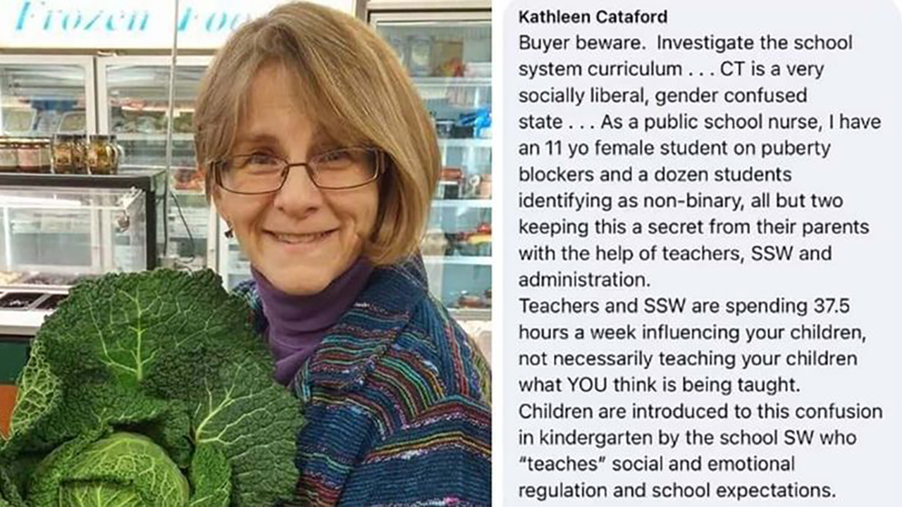 77-year-old Kathleen Cataford of Hartford, Connecticut, was suspended from the Richard J. Kinsella Magnet School after she posted in a mom’s Facebook group that an 11-year-old girl at the school was given puberty blockers, and noted that 12 others identified as “non-binary.”