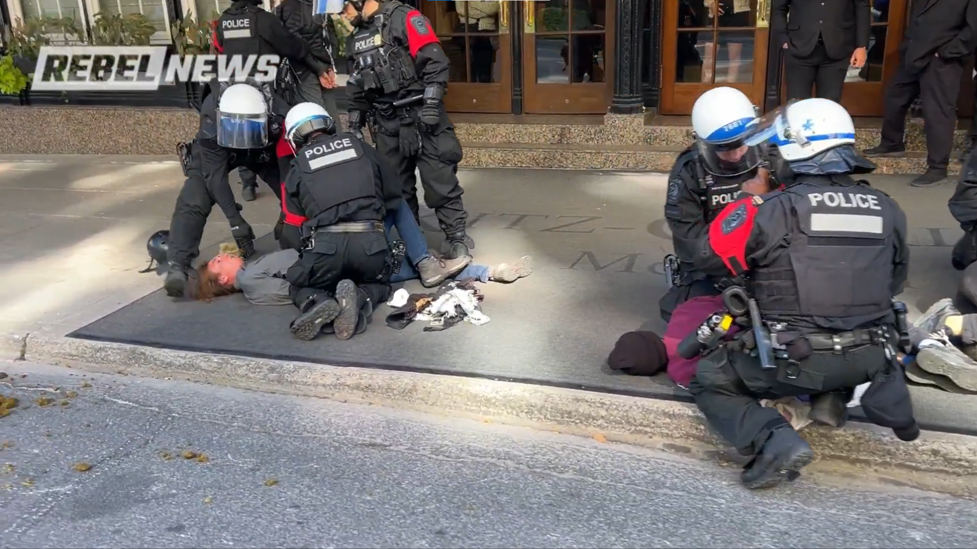 Video footage shows suspects pinned to the ground as officers confiscated helmets and protest gear.