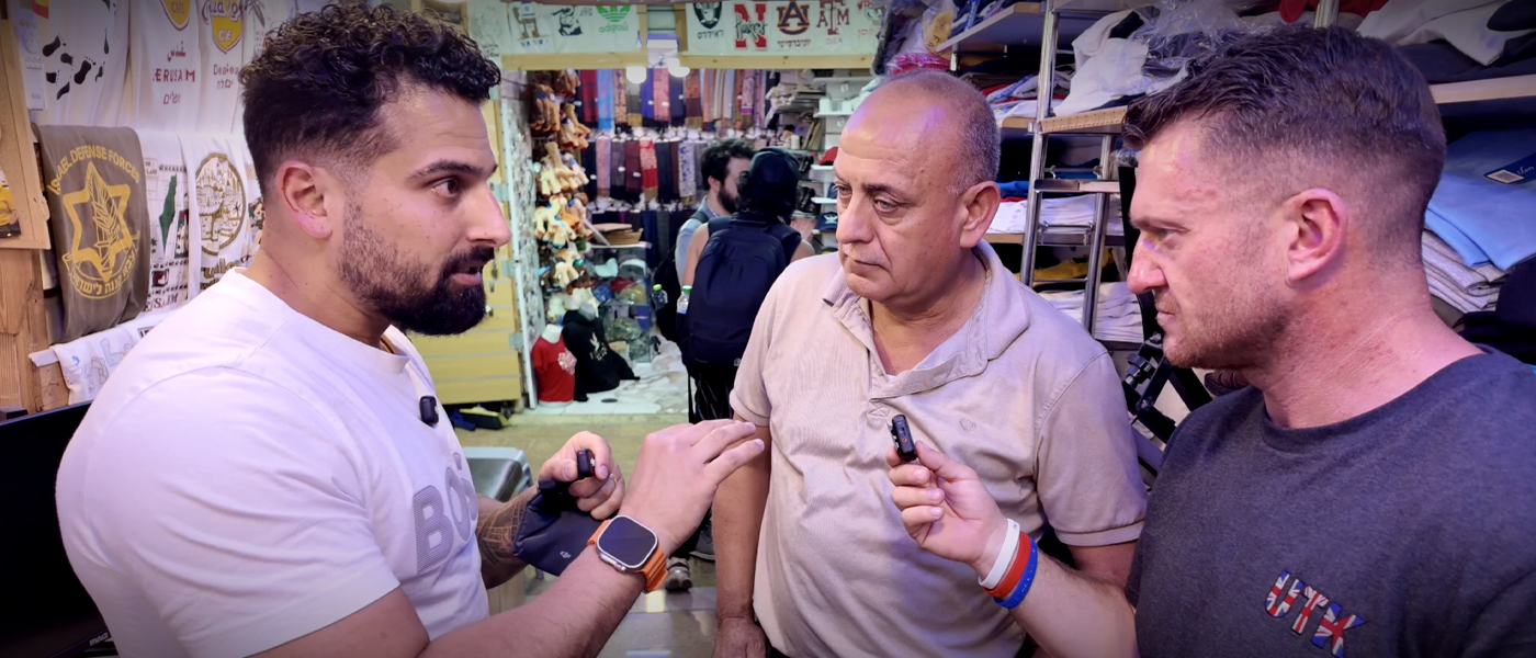 During a stop in Jerusalem, Tommy Robinson and Avi Yemini spoke to a Palestinian shopkeeper who asserted it would be safe to wave an Israeli flag in Ramallah, the West Bank city governed by the Palestinian Authority.