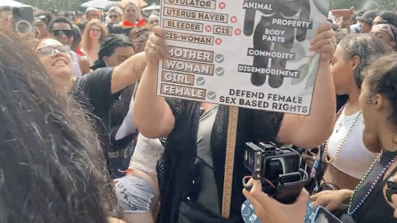 Lone woman advocating for women's rights faces violent confrontation by pro-LGBTQ+ mob at NYC Pride