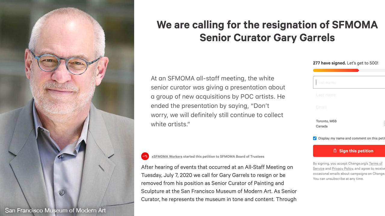 “After hearing of events that occurred at an All-Staff Meeting on Tuesday, July 7, 2020 we call for Gary Garrels to resign or be removed from his position as Senior Curator of Painting and Sculpture at the San Francisco Museum of Modern Art,” it read. “As Senior Curator, he represents the museum in tone and content.”