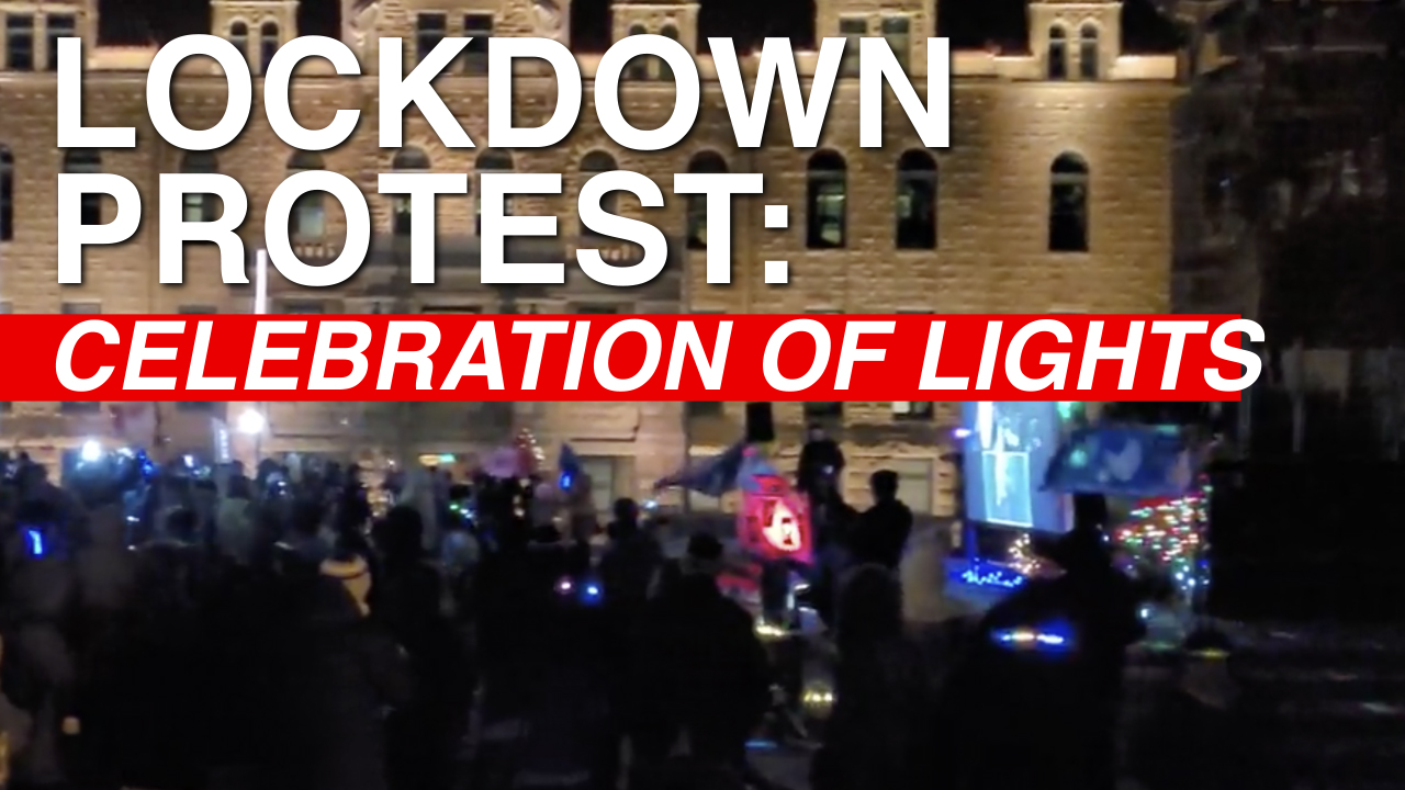 Saturday night in Calgary, the folks behind the weekly Walk for Freedom to protest the coronavirus lockdown restrictions organized an evening celebration of lights to show their opposition to the newly implemented provincial limits on social gatherings that require holiday get-togethers to be contained to single households.