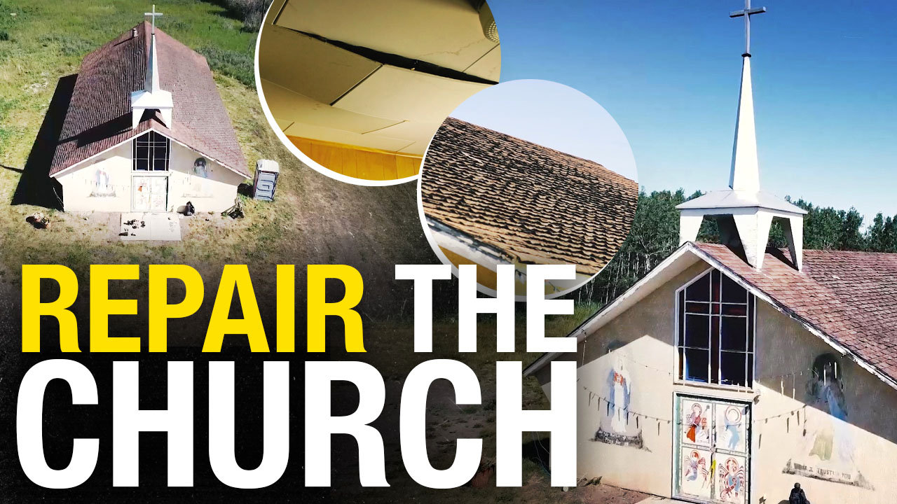 One of those journalists, Adam Soos, sought out Indigenous voices to hear their perspective on the church burnings. He met Ruby Starlight, a proud Tsuut’ina Nation woman working as a cultural guide at the Calgary Stampede’s Elbow River Camp. Ruby condemned the acts of hatred plaguing churches and shared her own family’s connection to the faith – her grandfather, Elder Dick Starlight, had helped build the local Catholic church on Tsuut’ina land decades ago. For Ruby and many in her community, Our Lady of Peace Church is a cherished place of worship, an anchor of hope that helped them endure the challenges of history. While this small church had thankfully not been vandalized, it was suffering from a different problem: the passage of time. On Ruby’s invitation, Rebel News visited Our Lady of Peace and found that the modest 1960s-era building was in serious disrepair. A leaking roof, pest infestations, and broken windows were jeopardizing the structure and leaving the little congregation in a tough spot. The Tsuut’ina parishioners “never had the money to renovate” the aging roof on their own, and without intervention, their beloved church’s future was uncertain.