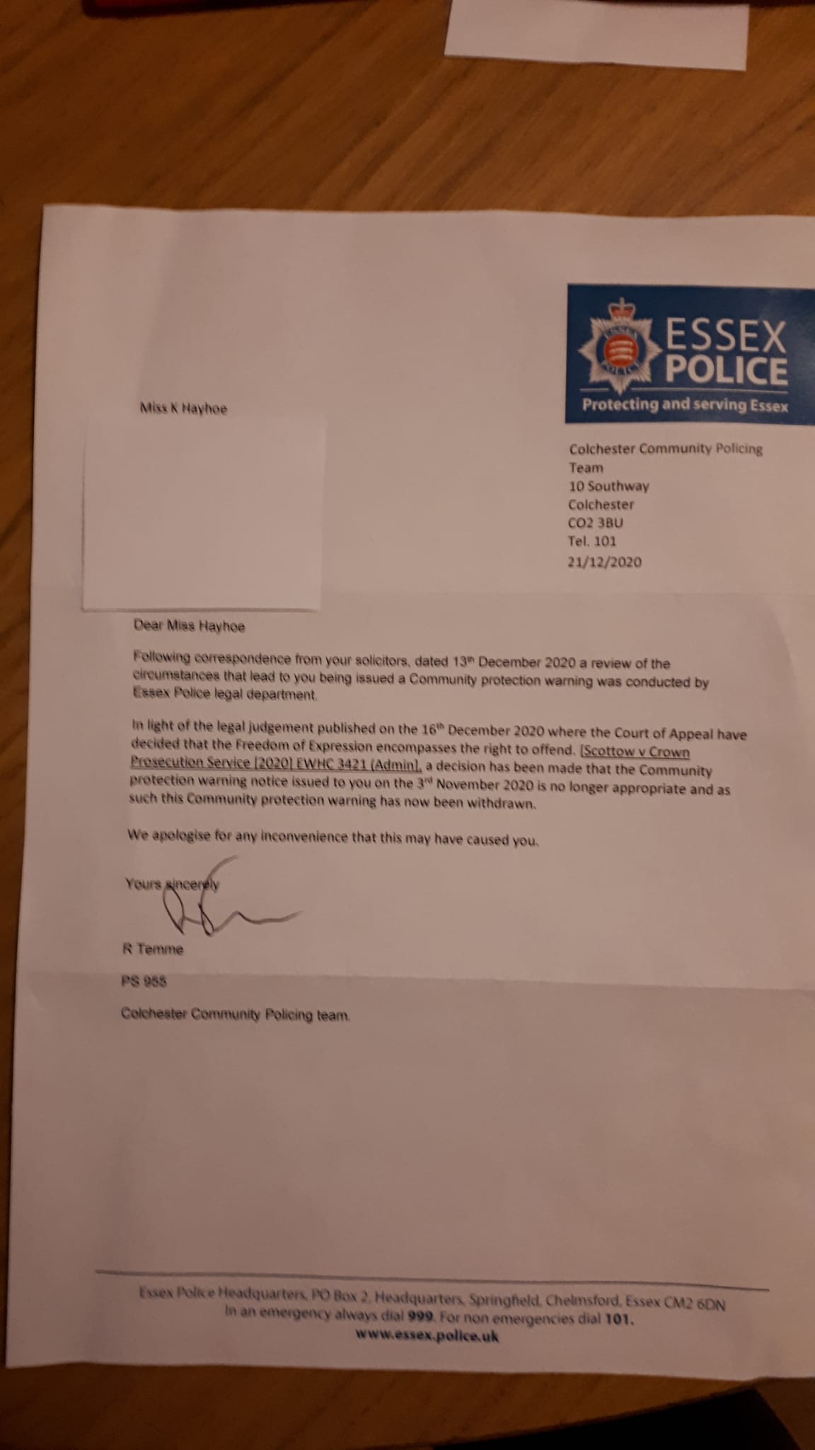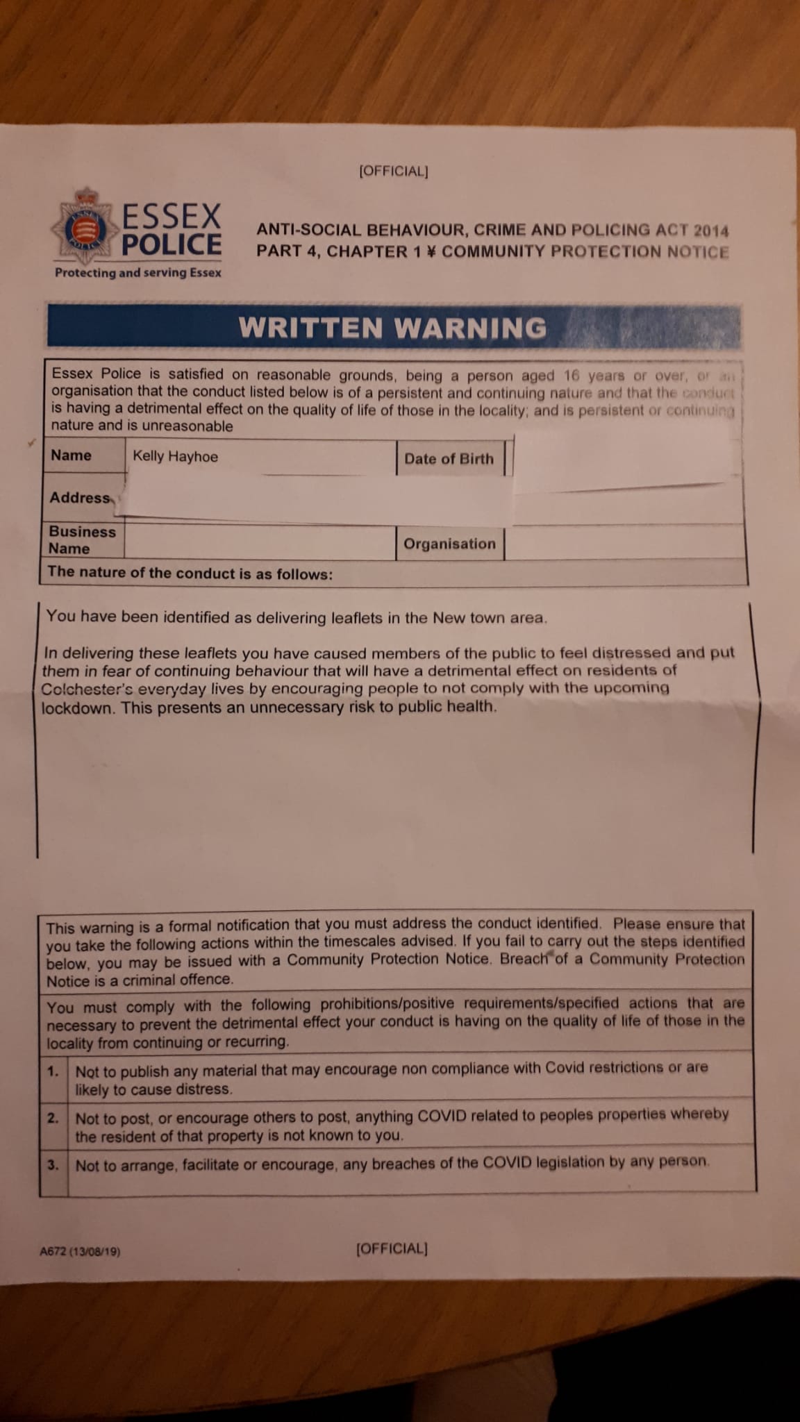 However, due to the contents of her leaflets the police paid her a visit and issued a warning stating that her anti-lockdown literature was causing distress to residents.