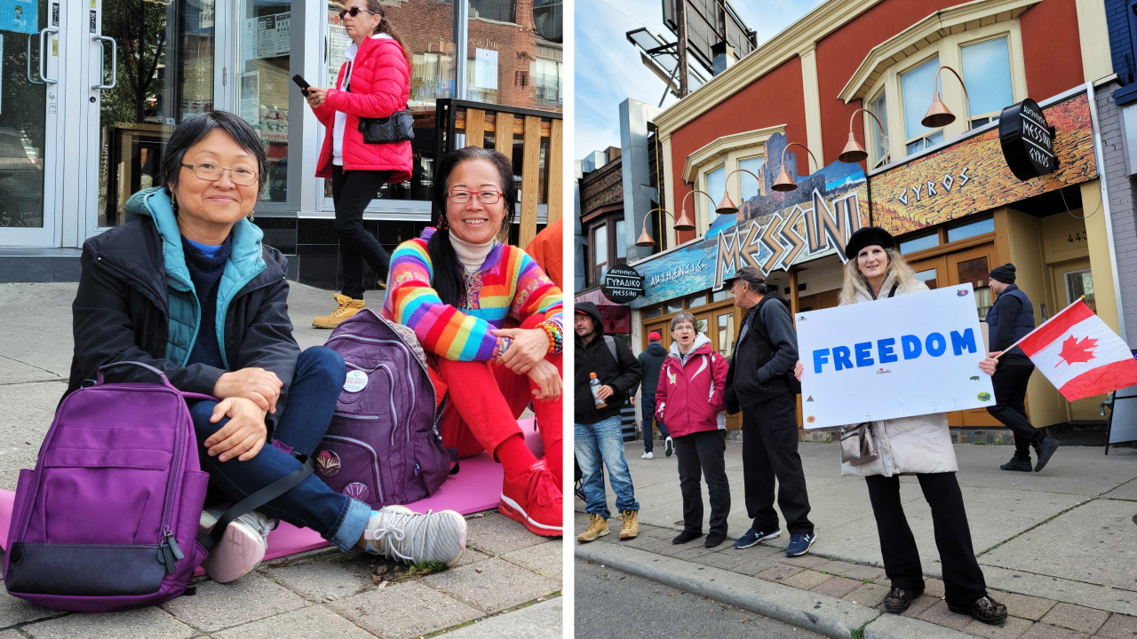 The protest was organized through a Telegram group to prevent censorship from tech giants, with dozens of protesters showing up for the picnic — along with a dozen Toronto police officers, as well as the mounted unit, with the officers guiding the protesters as they set up single file along the street in the heart of Toronto's Greektown.