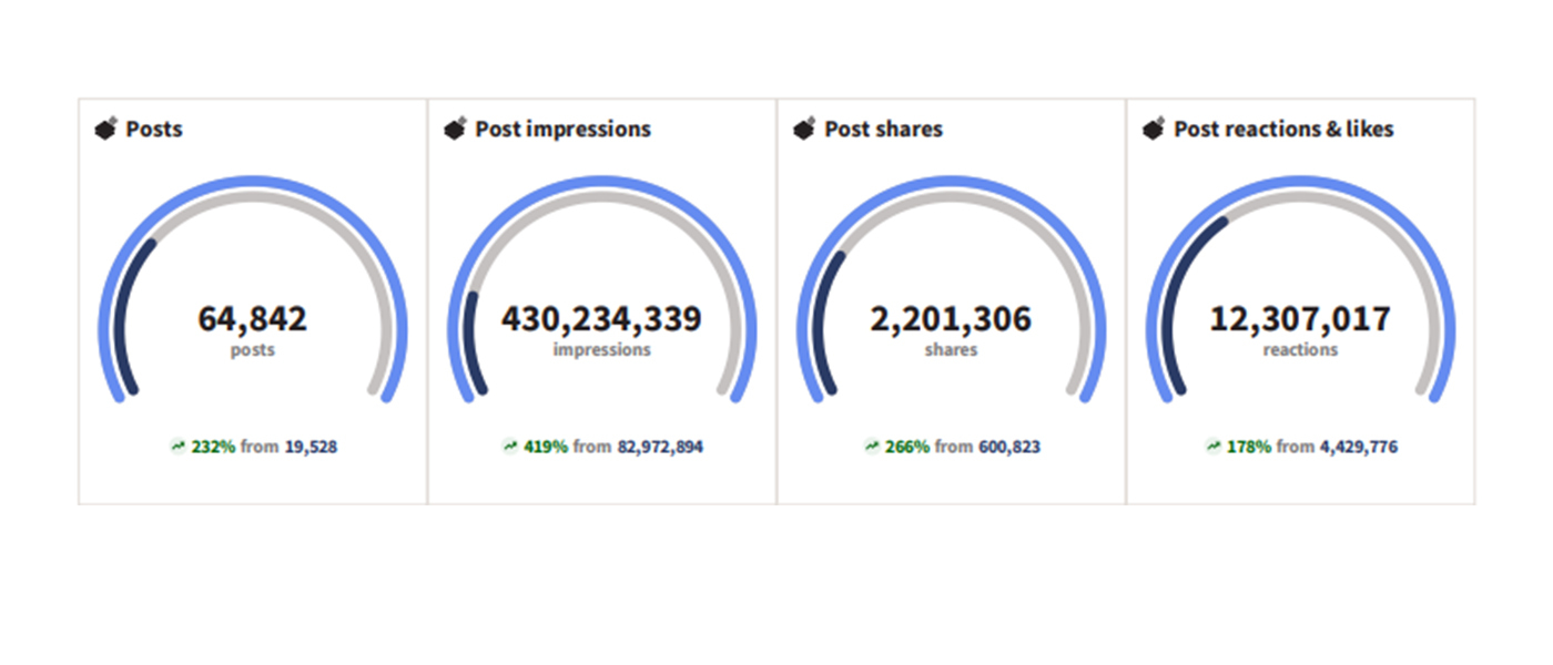 First of all, in 2025, we tripled the number of posts we did — that's Facebook posts, YouTube videos, tweets, etc. In 2024, we published 19,528 posts. This year, we published 64,842.